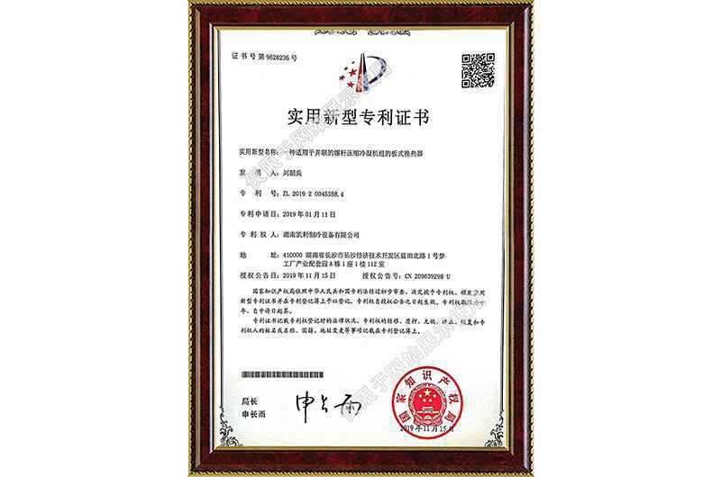 用于并联的螺杆压缩冷凝剂组的板式换热器专利证书